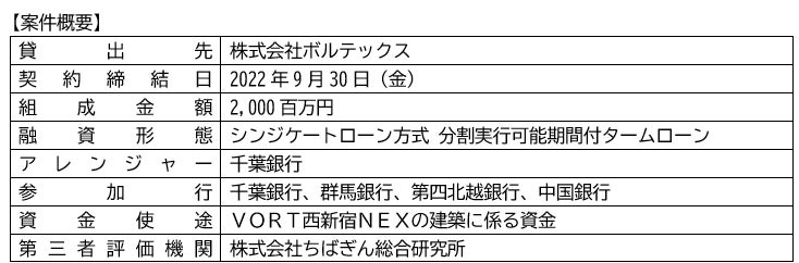 千葉銀行(頭取 米本 努)は、2022年9月30日(金)、株式会社ボルテックス(代表取締役社長 兼 CEO 宮沢 文彦、本社:東京都千代田区)に対して、「ちばぎんSDGsリーダーズローン(グリーンローン型)」を取り組みましたのでお知らせします。