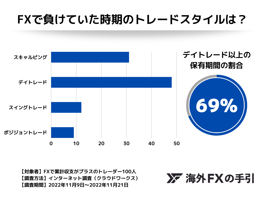 デイトレード以上の保有期間の割合が69%しかないことを考えると、FXで負けていた時期のトレードスタイルには「短期売買が多い」ことが分かります。
