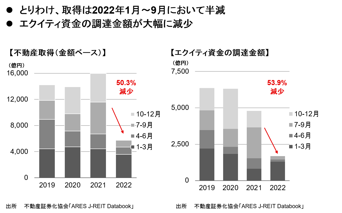 - 不動産投資市場の主要プレーヤーであるJ-REITの不動産取得は大幅に減少している。