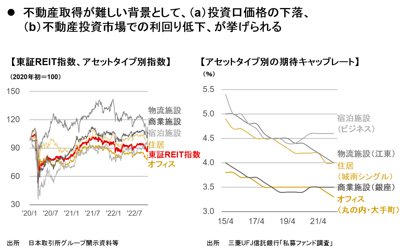 - 投資口価格の下落、不動産投資市場での利回り低下によって、J-REIT投資家目線での望ましい外部成長の難易度が高まっている。