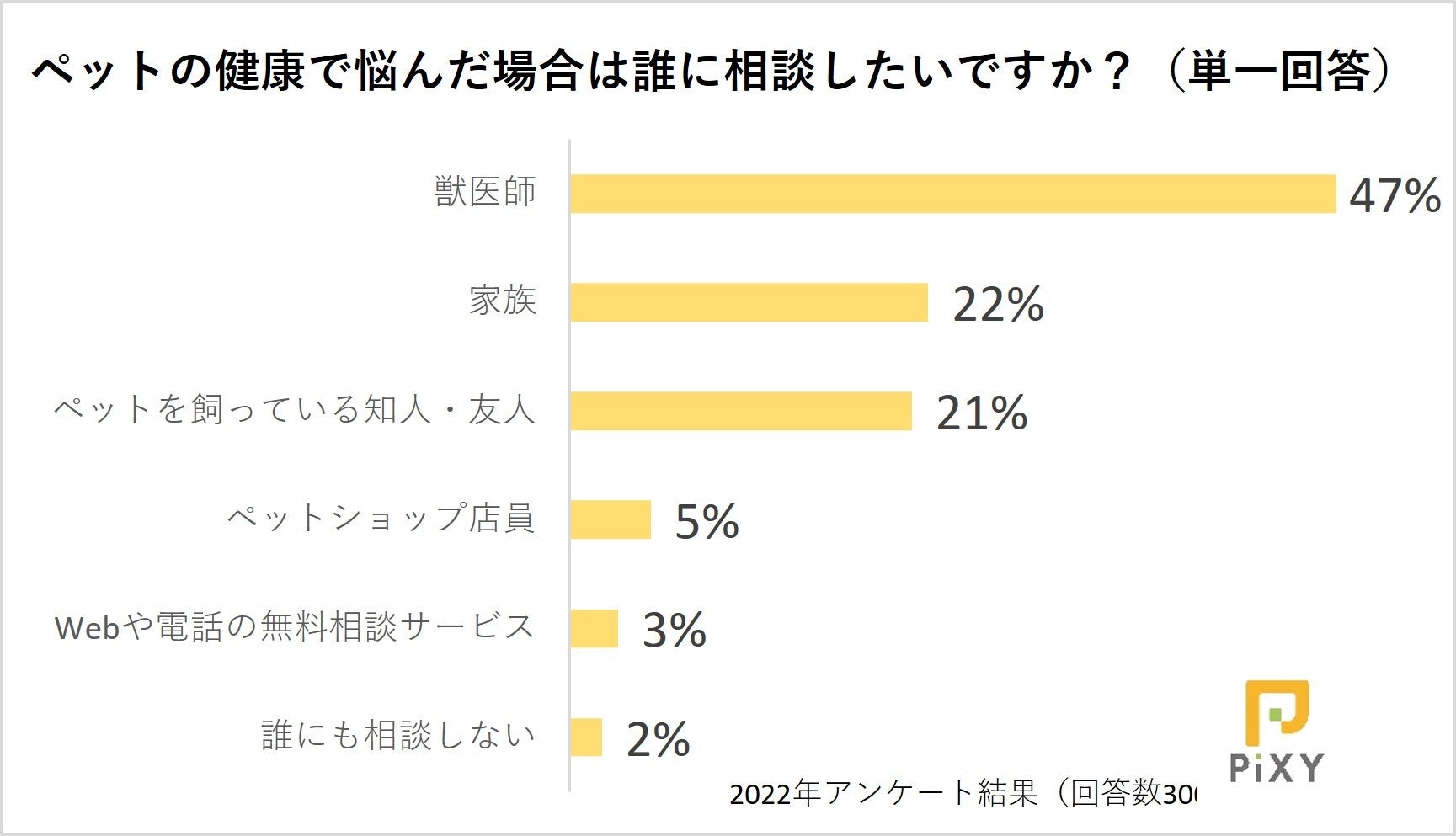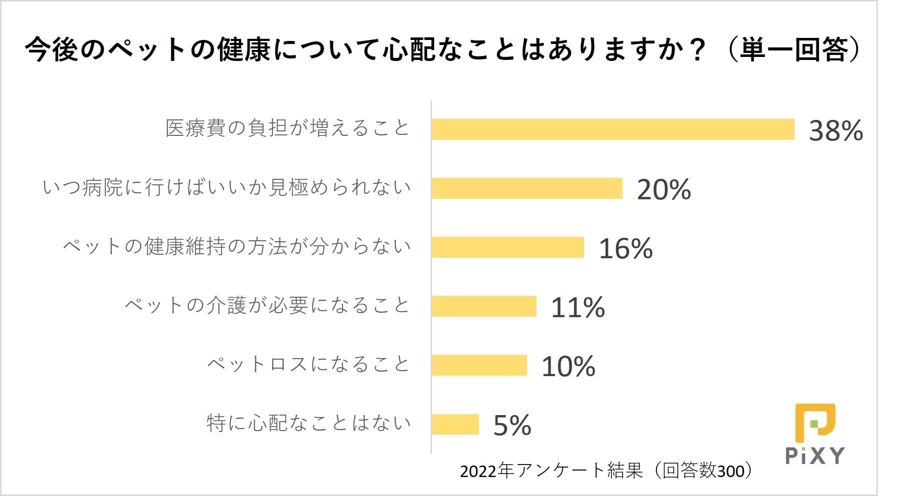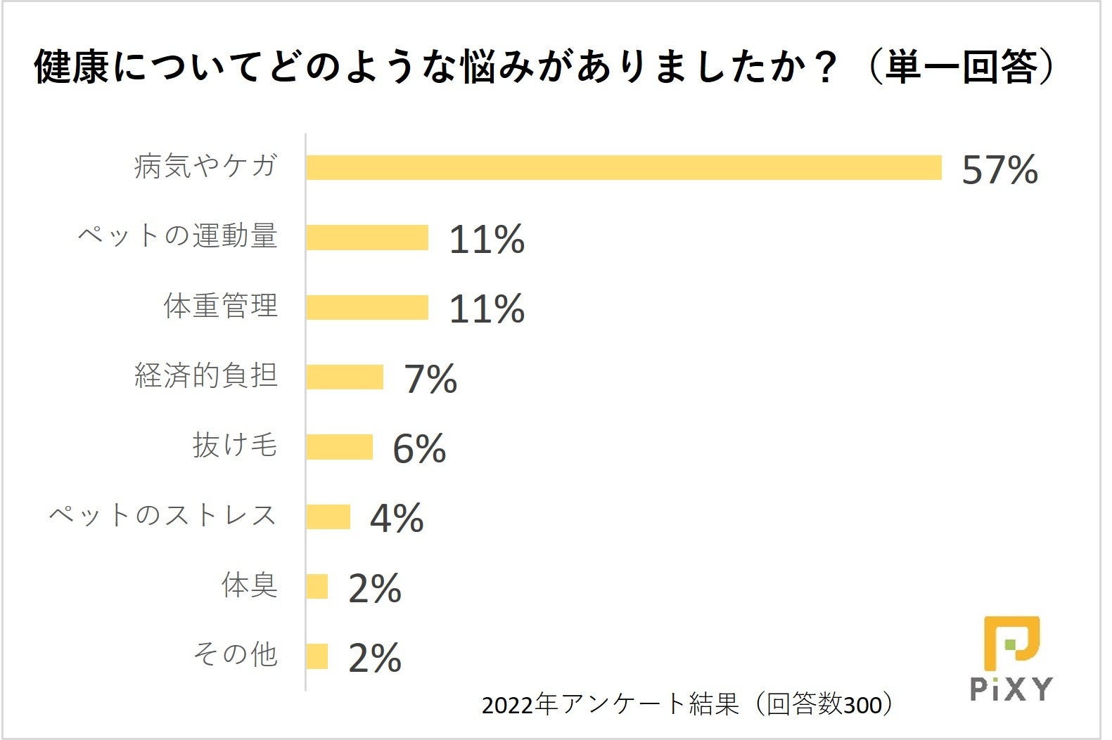 ペット領域のウェブマーケティングを専門とする株式会社ピクシー(東京都渋谷区代々木、代表取締役:小倉 鉄平、URL:https://pi-xy.co.jp/)は、定期的にペットに関する情報を調査してマーケティングの把握などに役立てており、ペットと飼い主さまの暮らしを向上させるため調査内容の一部を公開しています。今回はペットの健康に関する悩みについて、飼い主さま300人を対象に実施したアンケート調査の結果を発表します。