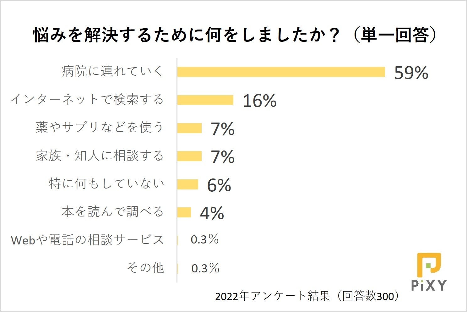 次に、悩みを解決するために何を行ったかを聞いたところ、59%の人が「病院に連れていく」と回答しました。悩みを解決するために最も効果的な手段が、病院で獣医師の診察を受けることかもしれません。