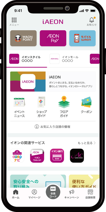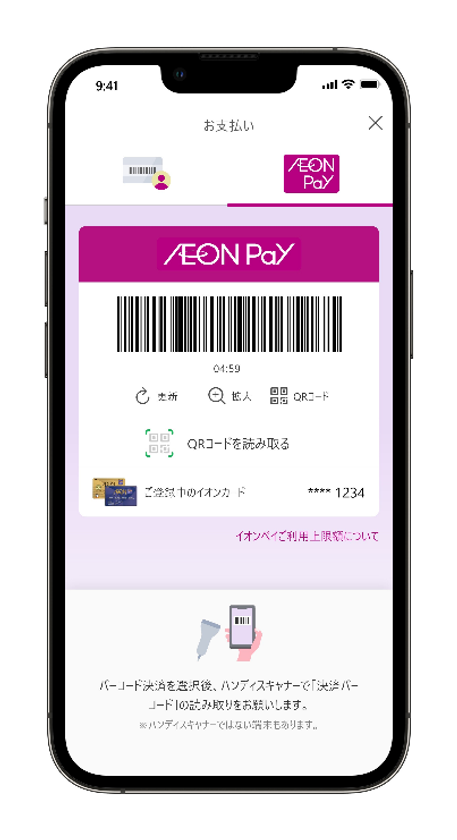 ※1:「AEON Pay」はイオンのトータルアプリ「iAEON(アイイオン)」またはイオンカード公式アプリ「イオンウォレット」をダウンロードいただき、イオンマークのカードを登録することで利用可能となります。イオンのグループ店舗をはじめとした全国のAEON Pay加盟店のレジにて、スマートフォンに表示されたコードを提示することで、簡単に決済することができます。