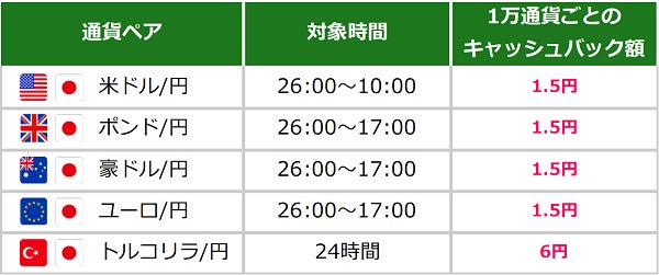 なお、「トルコリラ/円」は、24時間すべてのお取引でキャッシュバックをお受け取りいただけます。