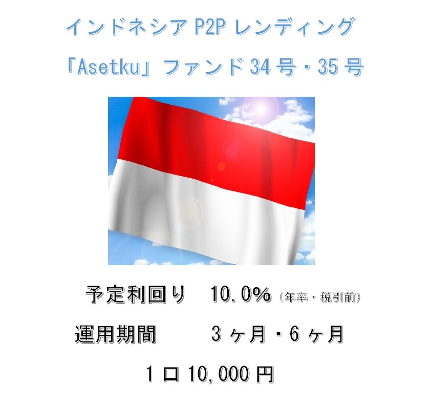 サン・キャピタル・マネジメント株式会社(大阪市中央区、代表取締役社長:前田利和)が運営するソーシャルレンディングサービス「アンシンバンク」は、本日15:00よりインドネシアP2Pレンディング「Asetku」ファンド34号・35号の募集を開始いたします。