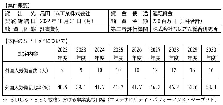 千葉銀行(頭取 米本 努)は、2022年10月31日(月)、島田ゴム工業株式会社(代表取締役社長 早田 和宏、本社:埼玉県吉川市)に対して、「ちばぎんSDGsリーダーズローン(サステナビリティ・リンク・ローン型)」を取り組みましたのでお知らせします。