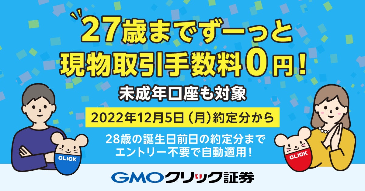 GMOインターネットグループのGMOフィナンシャルホールディングス株式会社の連結会社で、金融商品取引業を営むGMOクリック証券株式会社(本社:東京都渋谷区、代表取締役社長:鬼頭 弘泰、以下:当社)は、本日2022年12月5日(月)約定分より、27歳以下のお客様の現物取引手数料を無料化いたします。