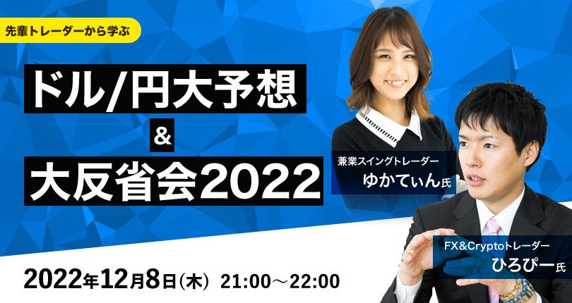 株式会社外為どっとコム(本社:東京都港区、代表取締役社長:竹内 淳)は、明日12月8日(木)21時より、当社主催の無料オンラインセミナー『ドル/円大予想&大反省会2022(FX投資の先輩トレーダーから学ぶ)』を開催することとなりましたので、お知らせいたします。