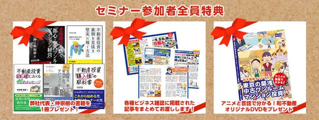 弊社不動産投資セミナーへご参加くださった方には、セミナー講師も務める、弊社代表取締役・仲宗根 和徳の執筆書籍を1冊と、各種ビジネス雑誌に掲載された記事を差し上げます!