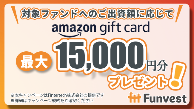 本ファンドへ出資していただいた投資家の皆様を対象として、出資額に応じて最大15,000円分のAmazonギフトカードをプレゼントするキャンペーンも併せて実施いたします。