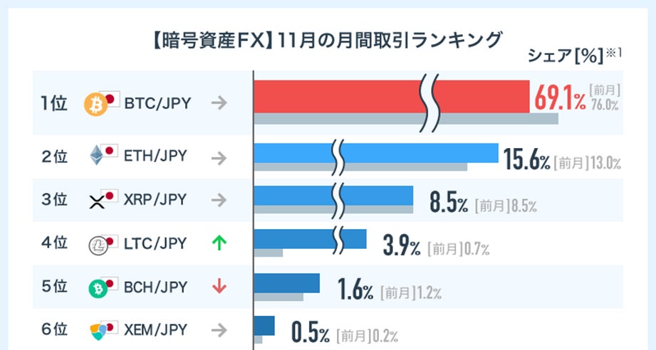 前月10月の取引ランキングと比較すると、販売所と同様にビットコイン(BTC)のシェアが下がり、その分アルトコインのシェアが上がる結果となりました。なかでもライトコイン(LTC)のシェアが5倍以上に伸びており、半年ぶりとなる4位にランクインしました。