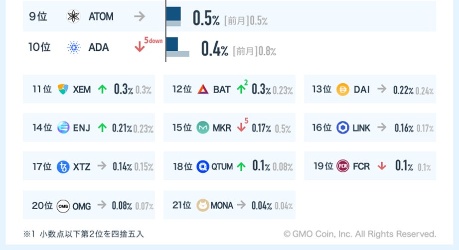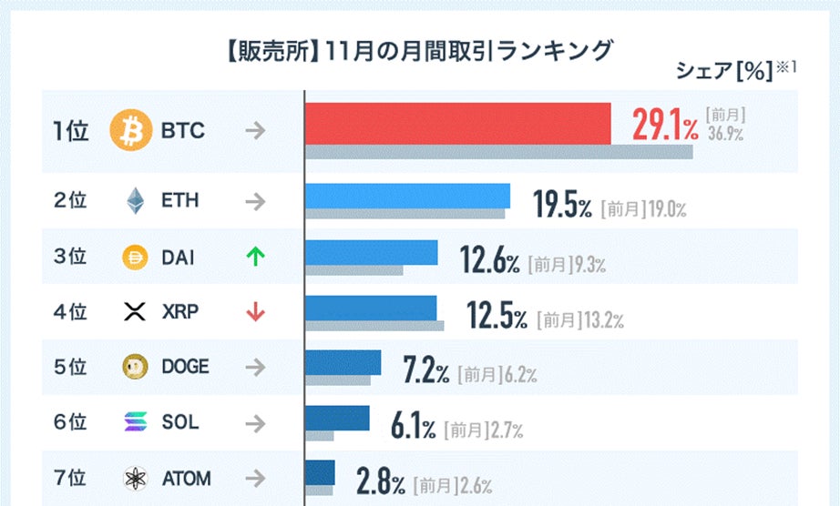 前月10月の取引ランキングと比較すると、ビットコイン(BTC)のシェアが約8%下落しました。反対に米ドルにソフトペッグされた暗号資産担保型ステーブルコインであるダイ(DAI)が円安の流れを受けて1つ順位を上げて3位となるなど、アルトコインの存在感が増す結果となりました。