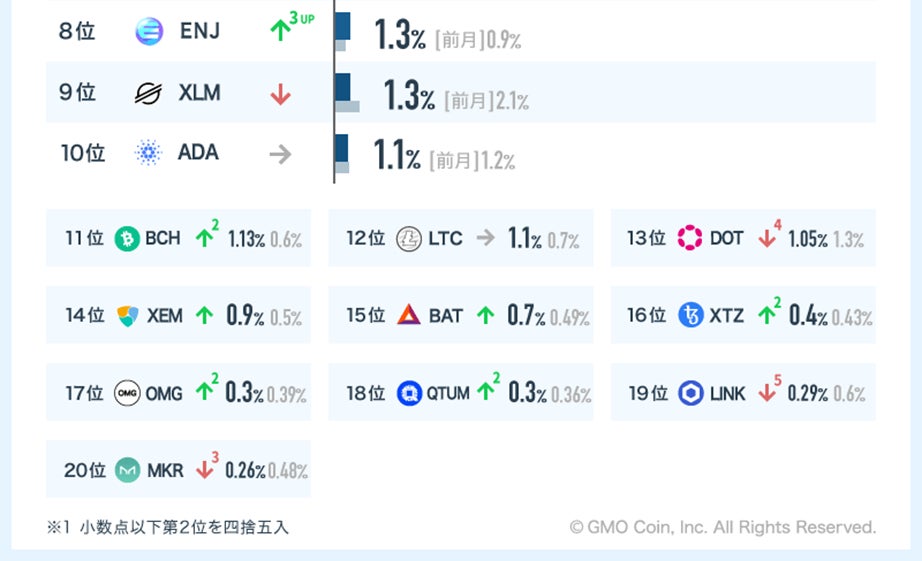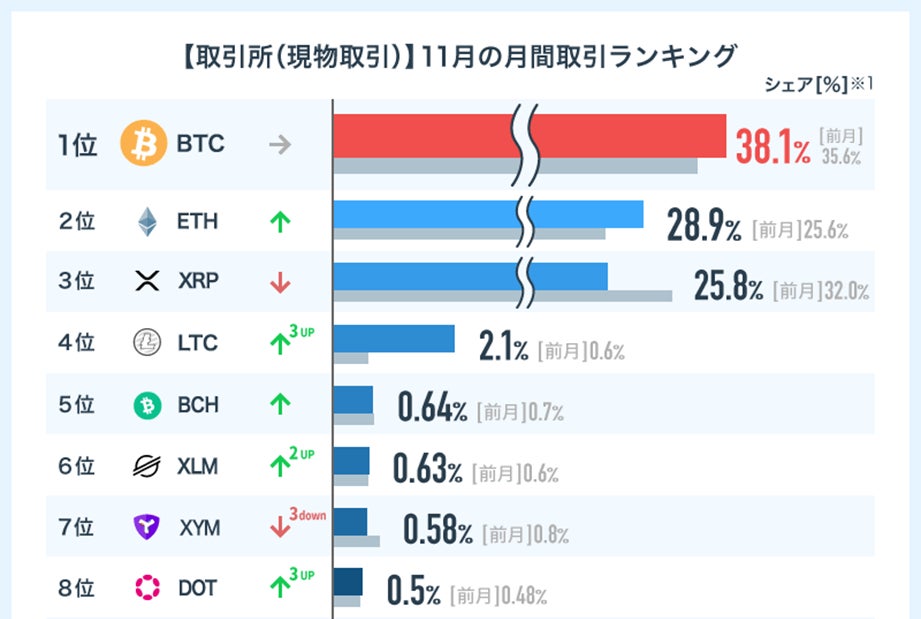 前月10月の取引ランキングと比較すると、大型アップデート終了に伴い一時的に取引が減少していたイーサリアム(ETH)がリップル(XRP)に代わり再び2位に返り咲きました。