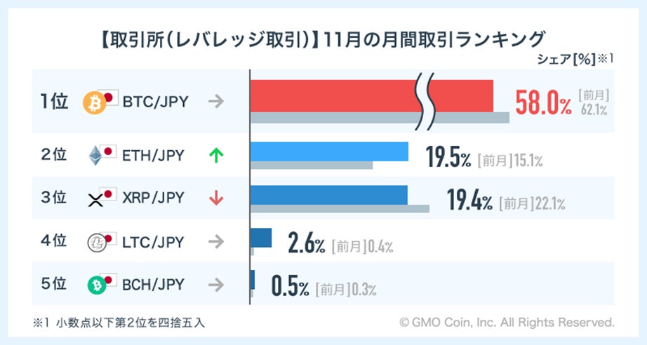 前月10月の取引ランキングと比較すると、取引所(現物取引)と同様にイーサリアム(ETH)のシェアが上がり、2位となりました。