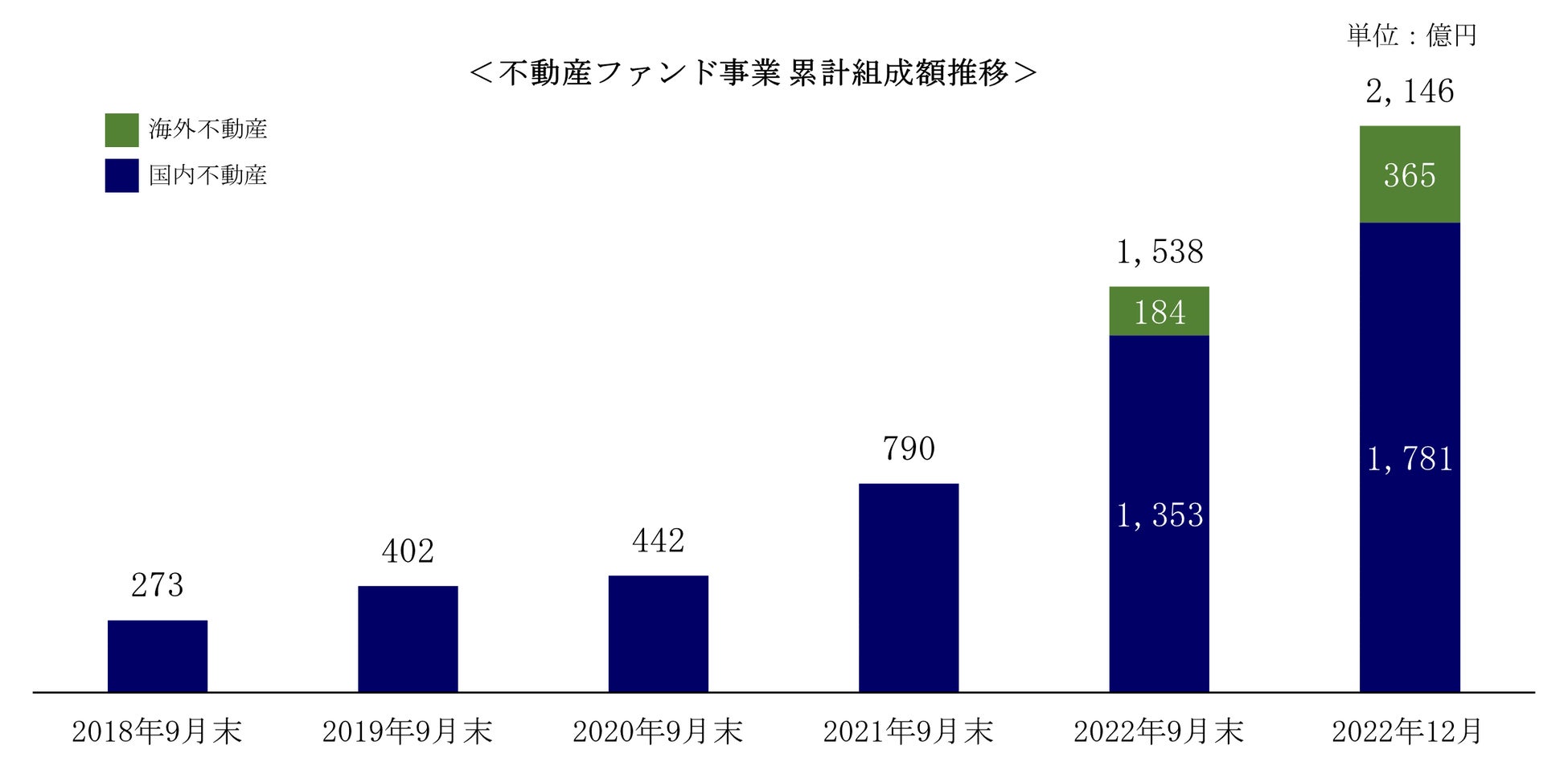 先般「過去最大の大規模案件となる組成用不動産(Premium Asset Series)の取得完了のお知らせ(https://ssl4.eir-parts.net/doc/7148/tdnet/2189095/00.pdf)」にてご案内した通り、国内不動産においてFPGリンクス渋谷道玄坂を2022年10月に組成したことに加え、本日公表の「海外不動産を対象とした集団投資事業案件の組成用不動産の取得完了のお知らせ」にてご案内の通り、海外不動産において米国ハワイ州ホノルル市の大規模リゾートホテルを取得した結果、不動産ファンド事業における累計組成額が、2021年9月末から約2.7倍、金額にして約1,360億円伸長し、2,000億円を突破いたしました。