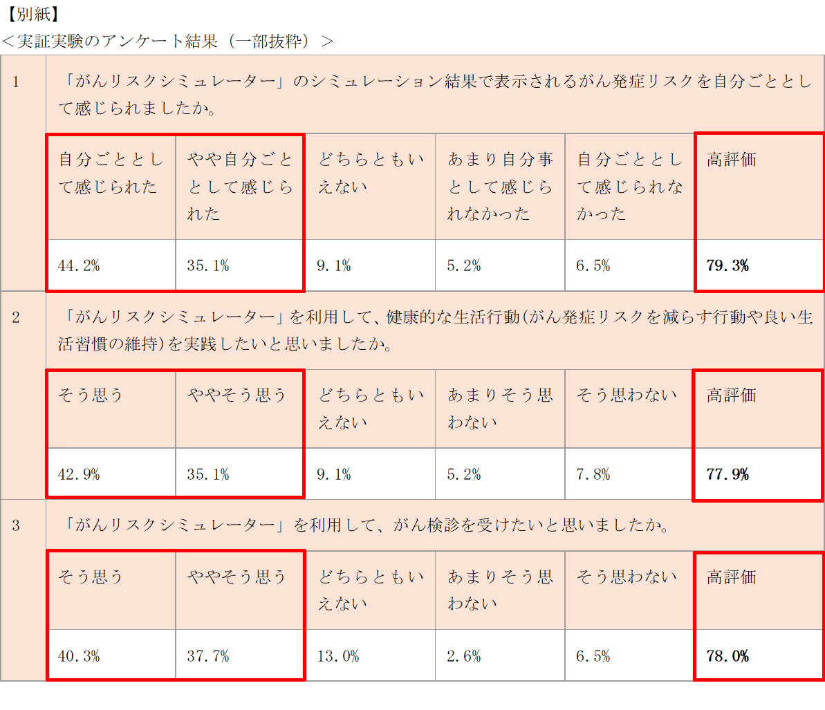 こうした背景のもと、2022年4月に実施した実証実験では、本サービスの利用により「がん発症リスクを自分ごととして感じられた」「健康的な生活行動(がん発症リスクを減らす行動や良い生活習慣の維持)を実践したいと思った」「がん検診を受けたいと思った」と回答したお客さまの割合はいずれも約8割を占め、がんの予防や早期発見への意識変容の効果があることが確認できました。(別紙参照)