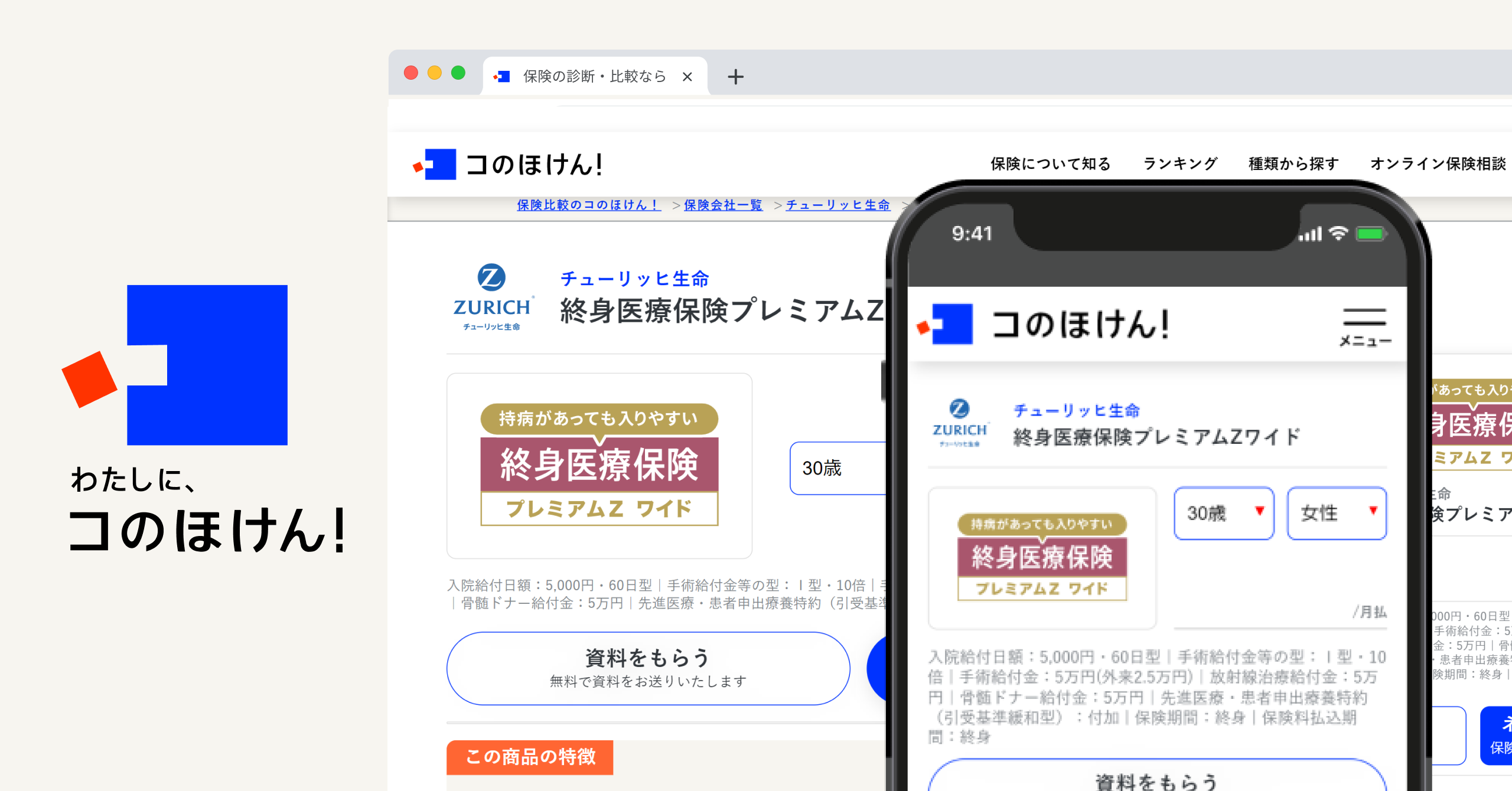 「コのほけん!」に掲載を開始した「終身医療保険プレミアムZワイド」は、インターネットまたは、郵送でお申し込みいただける保険商品です。「コのほけん!」PCサイトおよびスマートフォンサイトにて、商品の詳細をご確認頂けます。