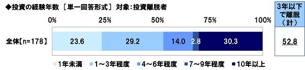 投資離脱者(178名)についてみると、投資の経験年数は、「1年未満」が23.6%、「1~3年程度」が29.2%で、合計した『3年以下で離脱』は52.8%、「4~6年程度」は14.0%、「7~9年程度」は2.8%、「10年以上」は30.3%となりました。