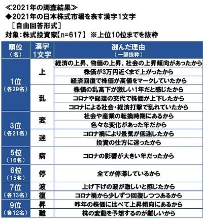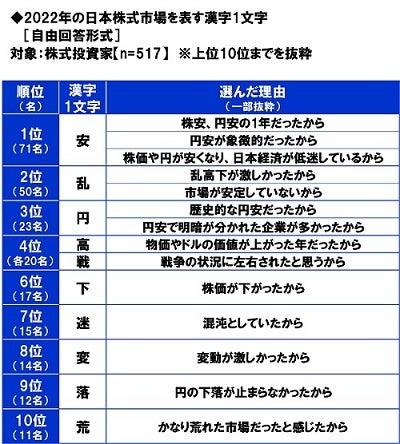 株式投資家(517名)に、2022年の日本株式市場を表す漢字1文字を聞いたところ、1位「安」(71名)、2位「乱」(50名)、3位「円」(23名)、4位「高」「戦」(いずれも20名)となりました。