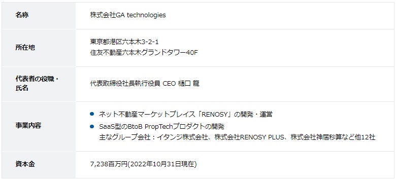 住信SBIネット銀行株式会社(本社:東京都港区、代表取締役社長(CEO):円山 法昭、以下「住信SBIネット銀行」)は、ネット不動産マーケットプレイス「RENOSY(リノシー)」を提供する株式会社GA technologies[GAテクノロジーズ](本社:東京都港区、代表取締役社長執行役員CEO:樋口 龍、証券コード:3491、以下「GA technologies」)と、不動産投資にかかわる金融サービスの実現に向けて協議を開始したことをお知らせします。