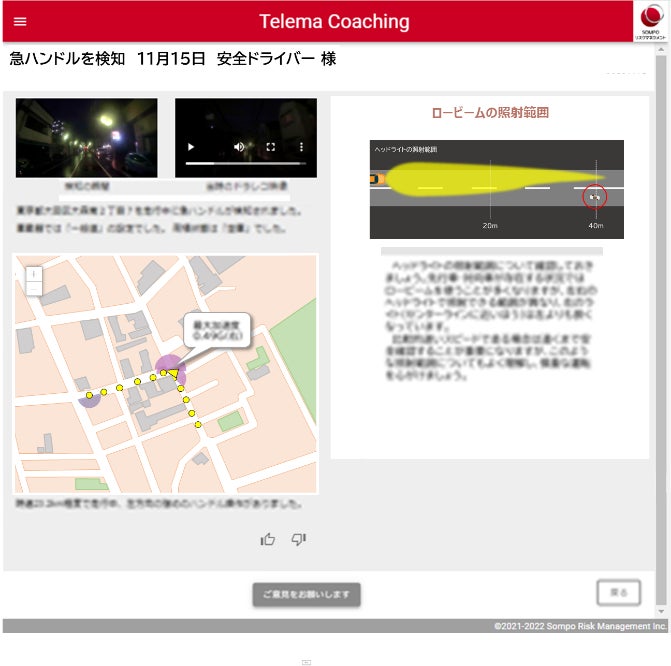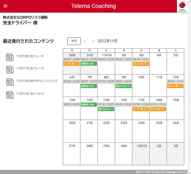 損害保険ジャパン株式会社(代表取締役社長:白川 儀一、以下「損保ジャパン」)とSOMPOリスクマネジメント株式会社(代表取締役社長:桜井 淳一、以下「SOMPOリスク」)は、テレマティクス対応デジタルタコグラフ(以下「デジタコ」)を利用して事故防止に取り組む事業者の皆さまに向けて、テレマティクス連携型安全運転管理支援WEBサービス「テレマコーチング」の提供を2023年1月から開始します。また、これに向けてまずは12月から、一部のテレマティクスサービス※1をご利用のお客さまについて募集を開始しました。
