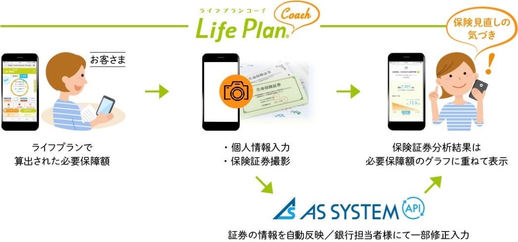 SOMPOひまわり生命保険株式会社(本社:東京都新宿区 取締役社長:大場康弘、以下「ひまわり生命」)が八十二銀行に提供しているライフプランシミュレーションアプリ「ライフプランコーチ for 八十二銀行」と当社の『ASシステム』を連携することにより、コンサルティング機能がさらに強化されます。