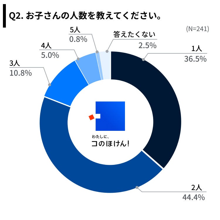 子どもの人数について、もっとも多かった回答は「2人」44.4 %です。次点で「1人」36.5 %、「3人」10.8 %と続きます。「ひとりっ子ではない割合」は61.1 %となりました。