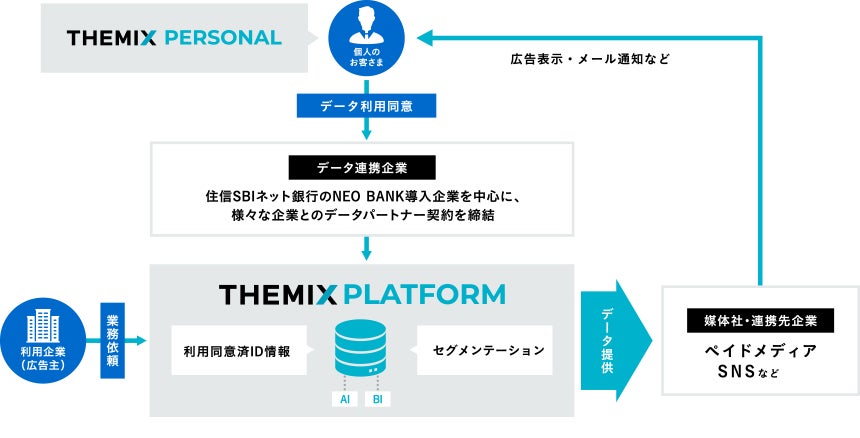 そしてこのたび、住信SBIネット銀行がこれまで培ってきたデジタルバンク事業、BaaS(Banking as a Service)※1によってパートナー企業へ銀行機能を提供する「NEOBANK®」※2事業に加え、アライアンス企業から連携されたお客さまが利用に同意した個人データを活用した、新たなデータプラットフォームサービスを開始いたします。