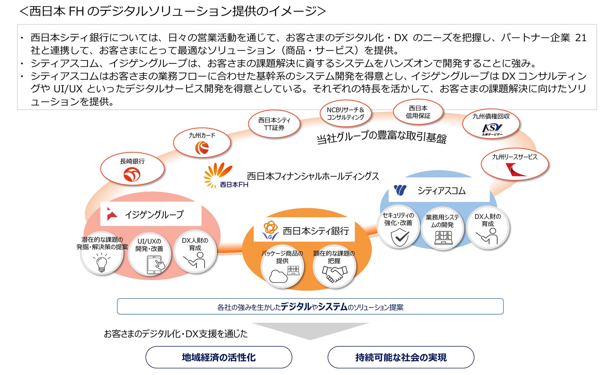 当社グループは、西日本シティ銀行を中核に、新たにグループに加わったイジゲングループを含む多様かつ特長あるグループ会社が一体となってお客さまへの伴走型企業支援に注力し、お客さまとの共通価値を創造することにより、地域経済の活性化と持続可能な社会の実現に貢献してまいります。