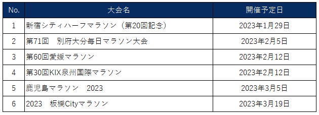 事業開始に先駆け、2023年1月29日開催の新宿シティハーフマラソンをはじめとする全国6 マラソン大会(下記参照、2023年1月5日時点)に協賛し、「Fin Spo」に向けた活動を推進して参ります。