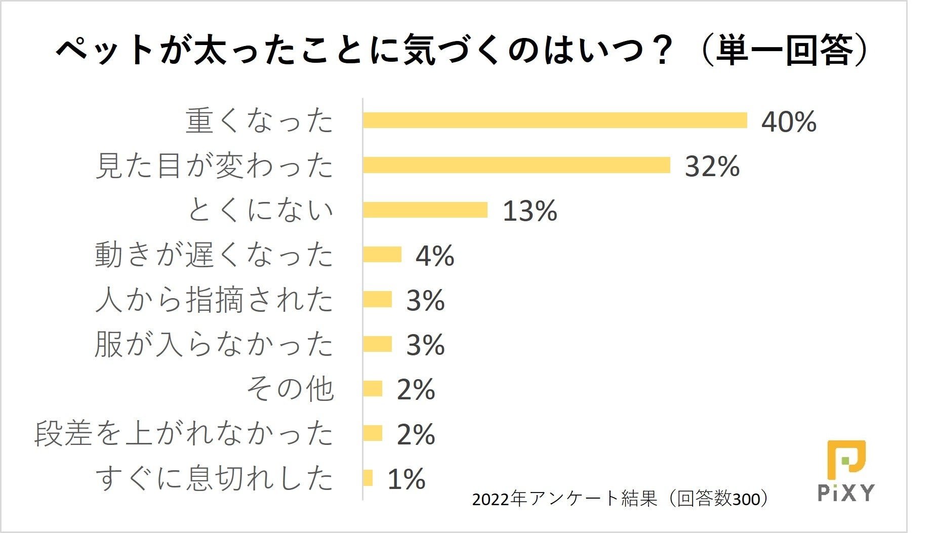 どのようなときにペットが太ったと気付くのかを聞いたところ、1位は「重くなったとき(40%)」、2位は「見た目が変わったとき(32%)」でした。