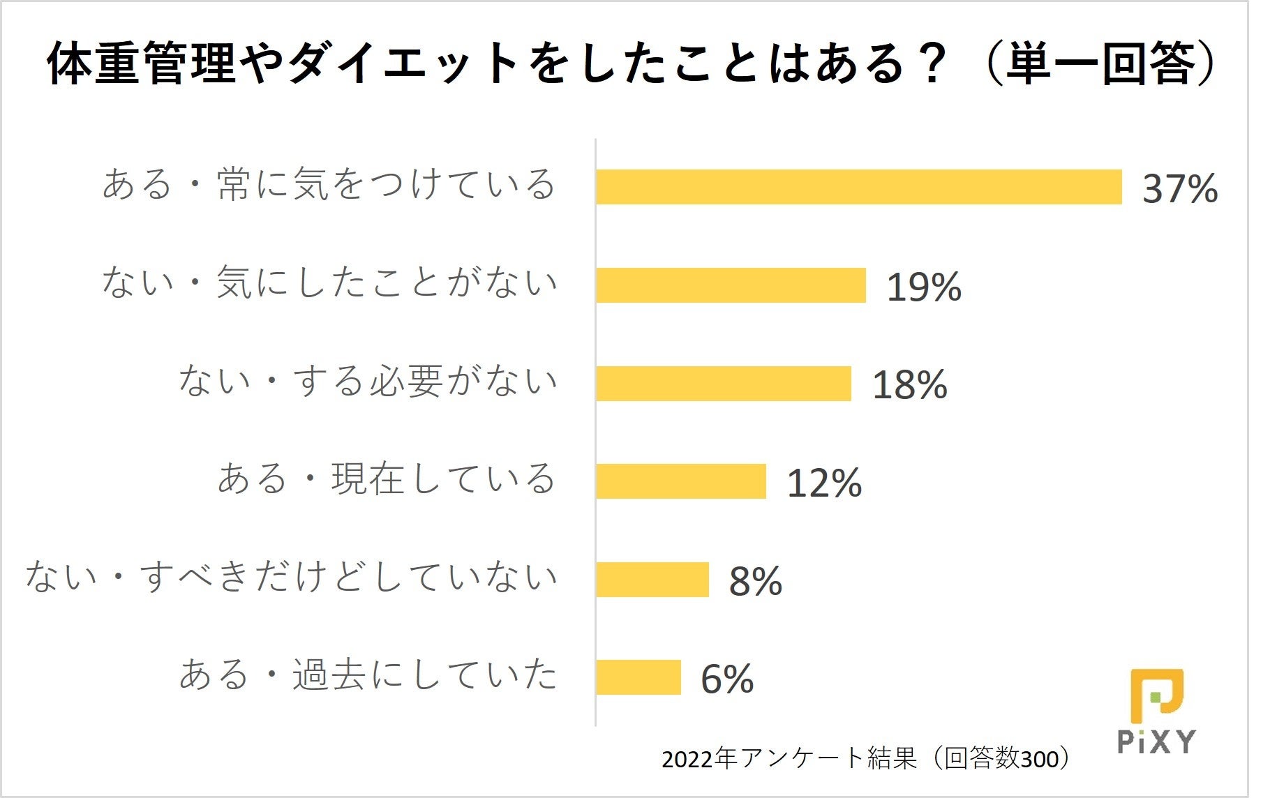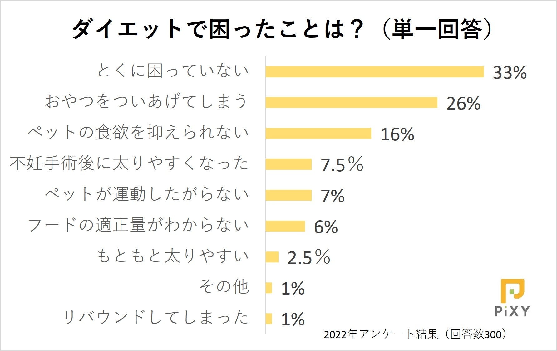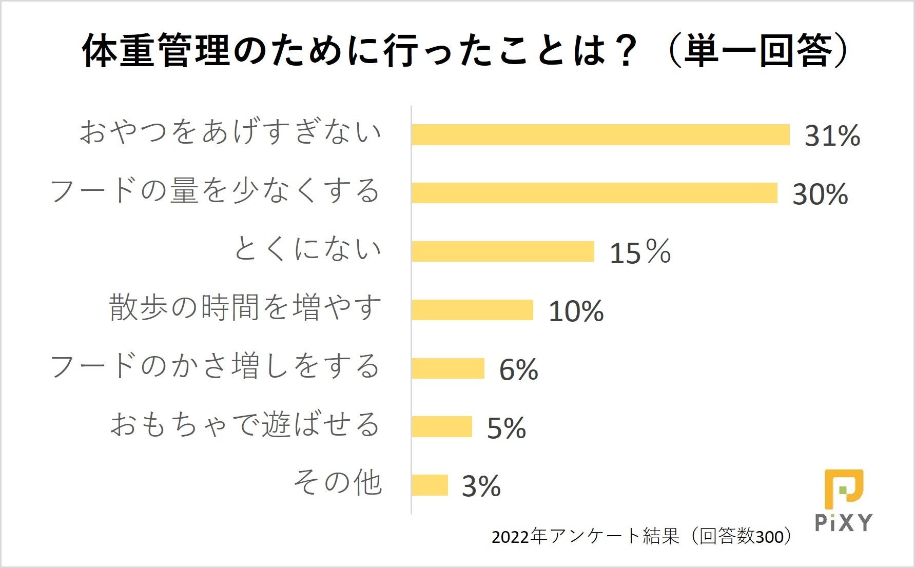 ペット領域のウェブマーケティングを専門とする株式会社ピクシー(東京都渋谷区代々木、代表取締役:小倉 鉄平、URL:https://pi-xy.co.jp/)は、定期的にペットに関する情報を調査してマーケティングの把握などに役立てており、ペットと飼い主さまの暮らしを向上させるため調査内容の一部を公開しています。今回はペットの体重管理について、飼い主さま300人を対象に実施したアンケート調査の結果を発表します。