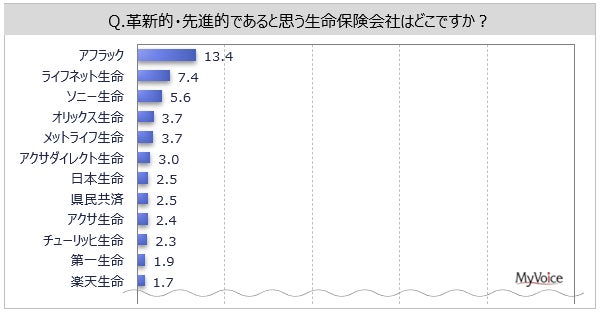 ■『独自性がある』『革新的・先進的である』と思う生命保険会社は、どちらも「アフラック」「ライフネット生命」が上位2位。『独自性』は「県民共済」、『革新的・先進的』は「ソニー生命」が続く