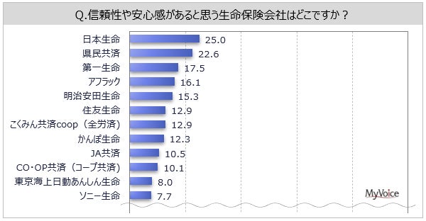 ■『信頼性・安心感がある』と思う生命保険会社は、「日本生命」「県民共済」が各20%台、「第一生命」「アフラック」「明治安田生命」などが各10%台