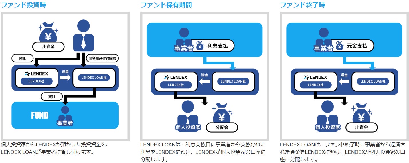 ファンド終了時に事業者から返済された資金をLENDEXに預け、LENDEXが個人投資家の口座に分配します。