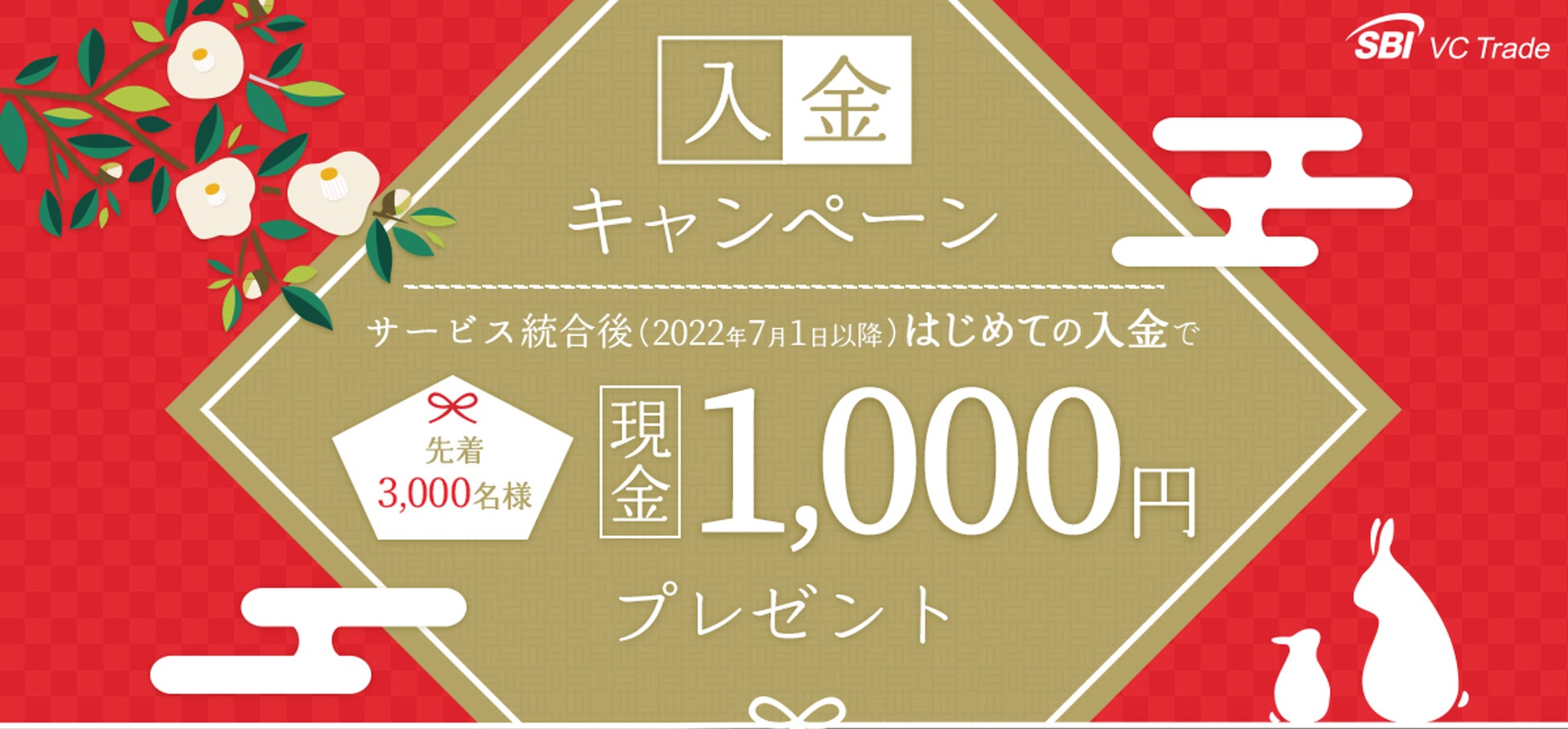 SBIグループにて暗号資産交換業を運営するSBI VCトレード株式会社(本社:東京都港区、代表取締役社長:尾崎 文紀、以下「当社」)は、2023年1月18日(水)より、サービス統合後(2022年7月1日以降)はじめて入金する方、先着で3,000名様にもれなく現金1,000円をプレゼントする入金キャンペーンを実施いたします。