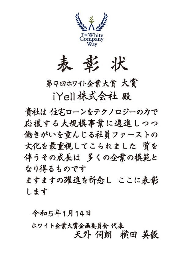 住宅ローンテックスタートアップのiYell株式会社(本社:東京都渋谷区、代表取締役社長 兼 CEO:窪田光洋、以下「iYell」)は、第9回ホワイト企業大賞にて大賞を2年連続受賞したことをお知らせします。