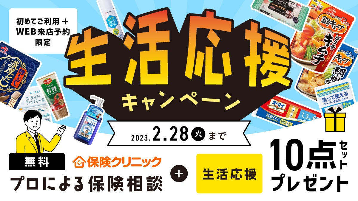 来店型保険ショップ『保険クリニック®』(全国257店舗 2023年1月20日時点、運営本部:株式会社アイリックコーポレーション 東京都文京区)は、2023年1月20日~2月28日に、「生活応援キャンペーン」を実施いたします。今回のキャンペーンでは、対象となるお客様に食品や日用品の詰め合わせ「生活応援10点セット」をプレゼントいたします。