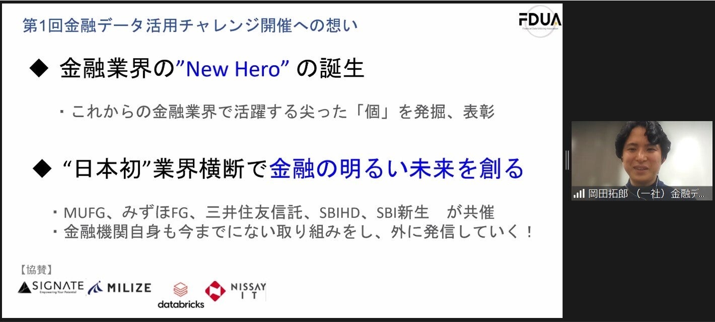 一般社団法人 金融データ活用推進協会(代表理事:岡田 拓郎、以下「当協会」)は、株式会社三菱UFJフィナンシャル・グループ(以下 MUFG)傘下のJapan Digital Design株式会社 (代表取締役CEO:河合 祐子)、みずほ第一フィナンシャルテクノロジー株式会社(代表取締役社長 安原 貴彦)、三井住友信託銀行株式会社(取締役社長:大山 一也)、SBIホールディングス株式会社(代表取締役会長兼社長:北尾 吉孝)、株式会社SBI新生銀行(代表取締役社長:川島 克哉)と共同で、データ分析コンペティション「第1回 金融データ活用チャレンジ」を2023年1月20日より開始し、その開会式を行いましたのでお知らせいたします。